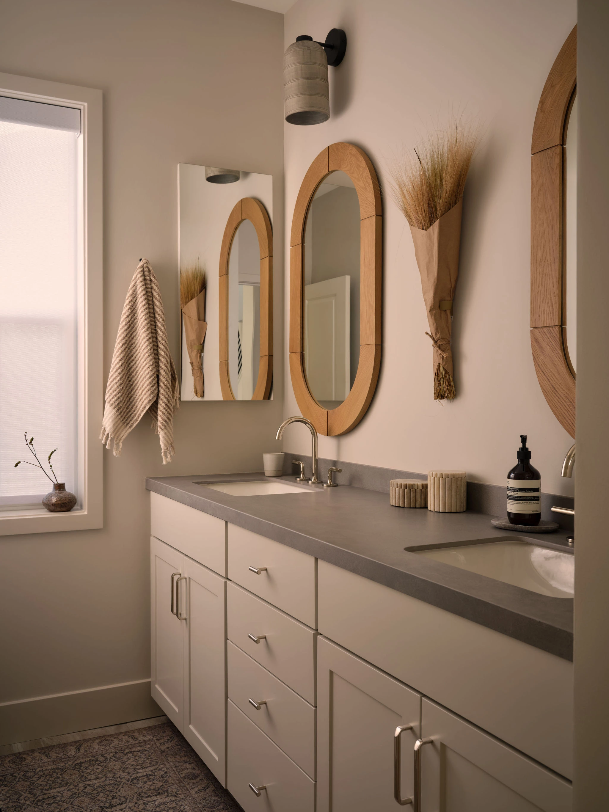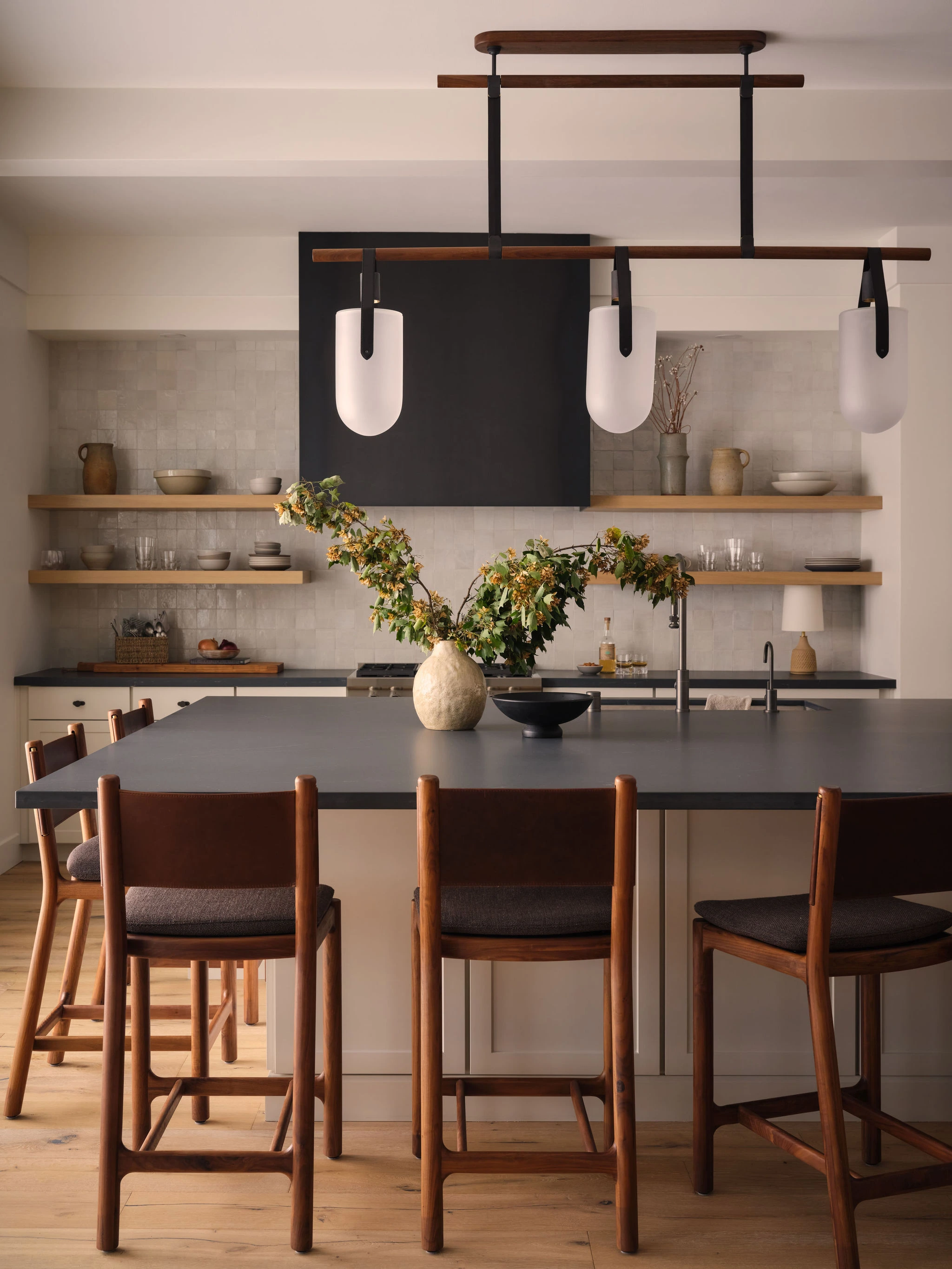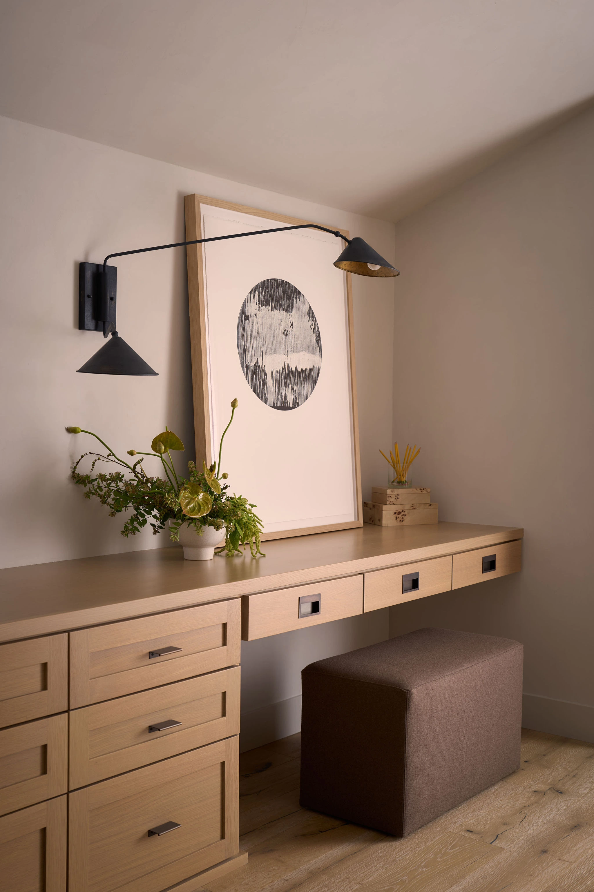 Every decision in this home was made with intention, ensuring the main rooms feel serene and grounded in natural materials—wood, glass, marble, brass, white oak flooring, and soft, creamy walls.